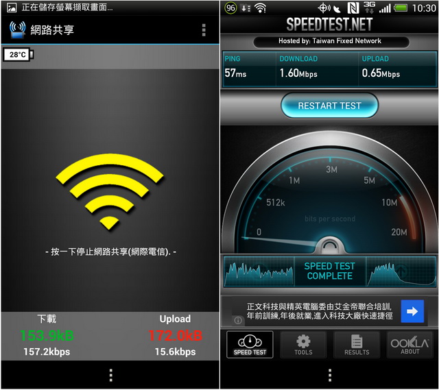 我實際測試亞太的3G網路也的確可以透過者個APP來做WiFi分享,速度在1.6M左右,也還ok啦,堪用啦