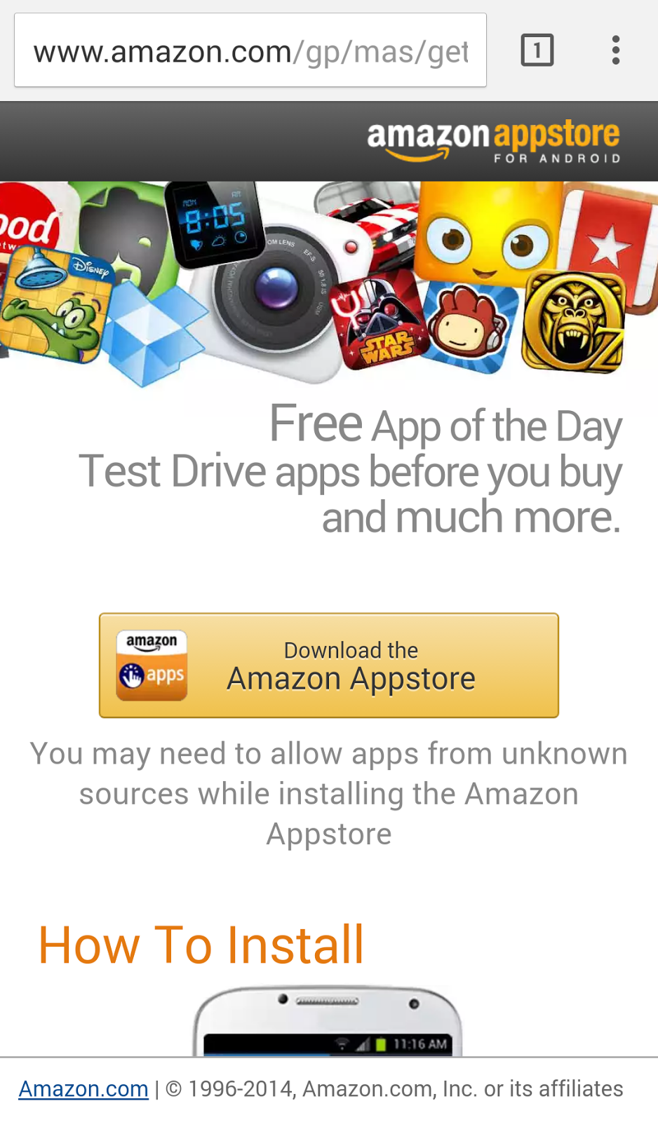 Amazon Appstore 下載」網頁,點擊中間的下載按鈕,把 Amazon 專屬的 Android 應用程式商城下載到手機並安裝。