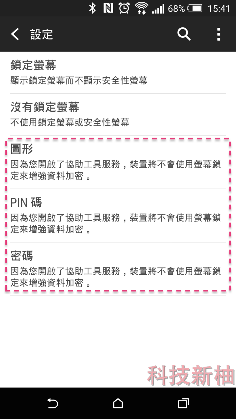 ▲ 首先您必須在安全性中將螢幕鎖定改為圖形、PIN 碼或是密碼的方式。
