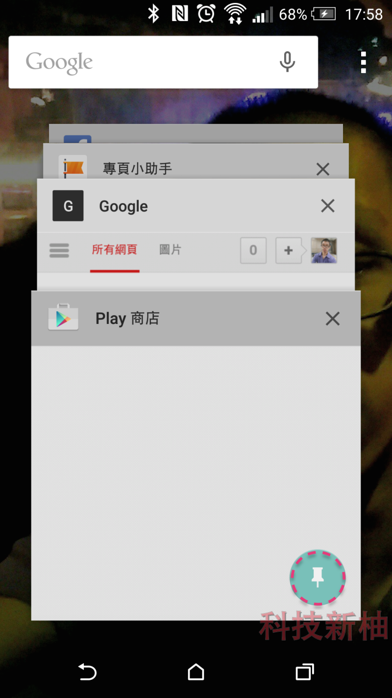 ▲ 這時候先開啟要釘選的畫面,然後按下右下角切換到「最近使用的應用程式」畫面,會發現多了一個大頭針,這個就是畫面釘選,要注意的是目前只能釘選最後執行的那一個 App。