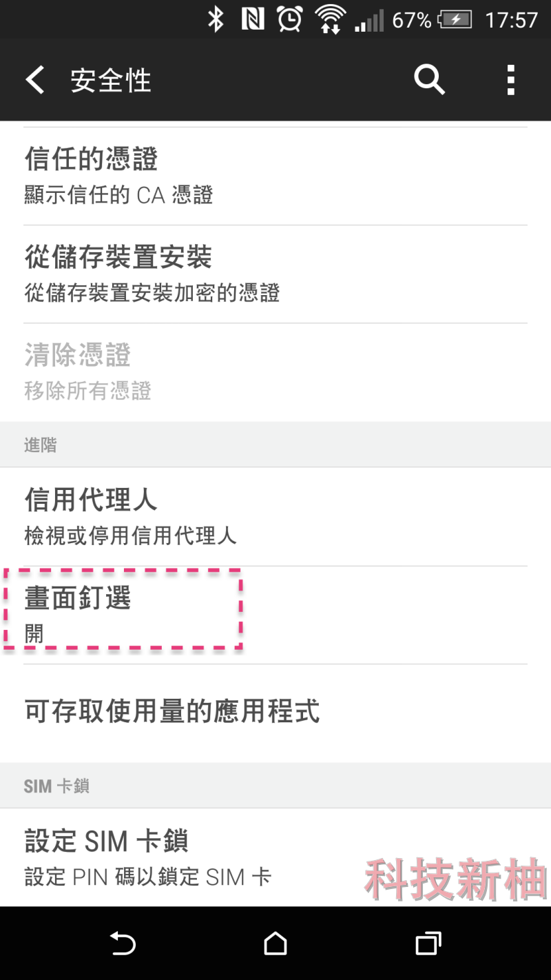 ▲ 螢幕固定功能的位置放在設定/安全性/畫面釘選。