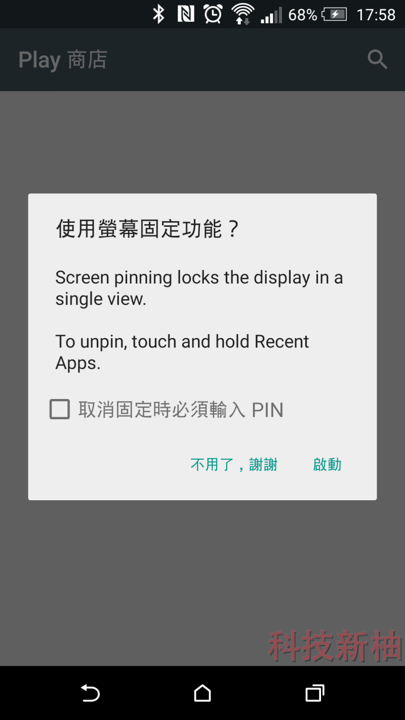 ▲ 這時候系統會詢問是否要釘選畫面?你也可以將「取消固定時必須輸入 PIN」勾選起來,如此一來要退出這功能就必須輸入 PIN 碼。