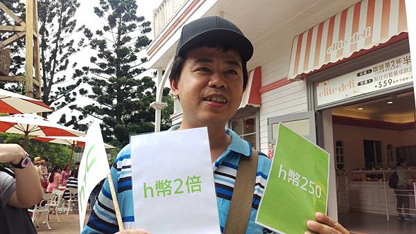 雖然有穿雨衣,但全身還是濕了~  我們抽到250H幣,但又抽到減半卡,嗚嗚...