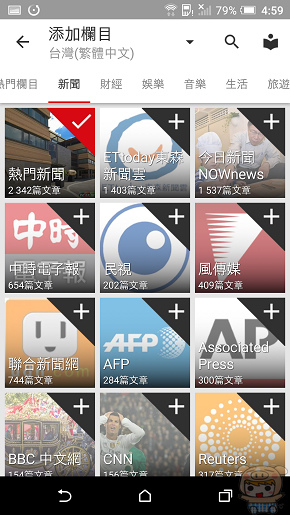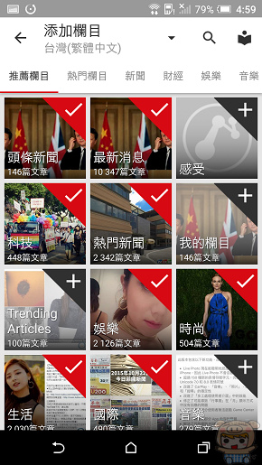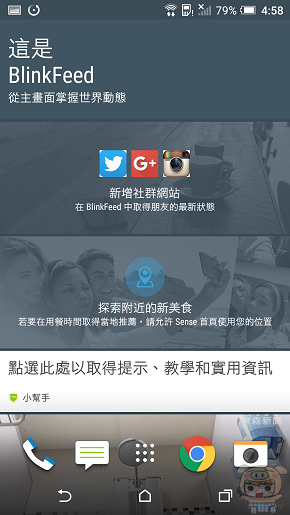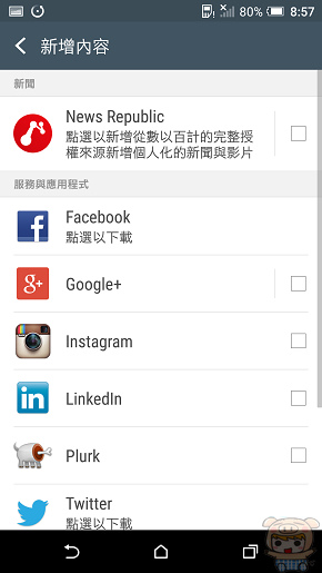 在新增內容裏,可以自由設定想要顯示在首頁HTC BlinkFeed™上的資訊,如使用者的Facebook、Twitter、instagram等動態,或是新聞、財經、娛樂、音樂、生活、旅遊美食、健康、時尚、綜合、正、兩岸、運動、科技&科學、遊戲、國際等等,各大頭條新聞網站、雜誌等等,都同時顯示在您的HTC BlinkFeed上,讓您隨時掌握世界的動態。