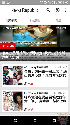 系統裏還預裝了一個News Republic的應用程式,這是全球知名的新聞應用程式,提供給用戶來自超過1100個簽約可信新聞資訊源為您呈現最新的個性化的即時新聞。提供了本地新聞,國際新聞,科技,政治,體育,娛樂以及一百萬各類主題選擇。
