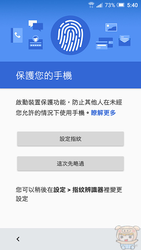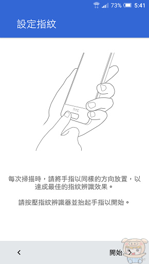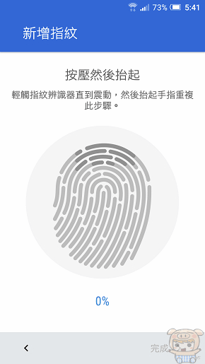 設定方式相當的簡單,點選新增指紋後,輕觸指紋辨識器,直到震動,再抬起手指,反覆的輕觸抬起,直到到圖示變成100%完成設定,之後喚醒手機只要輕觸指紋辨識器即可快速解鎖,再也不用慢慢的輸入密碼或是圖形解鎖。