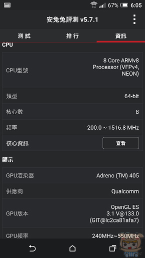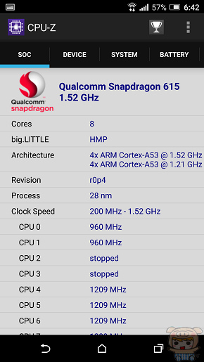CPU-Z的資訊如下:處理器為Qualcomm® Snapdragon™ 615 八核心處理器 1.52Ghz。