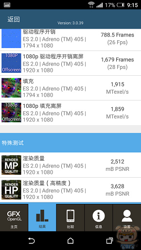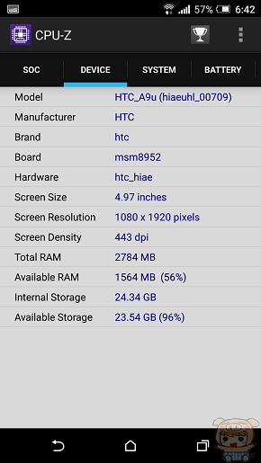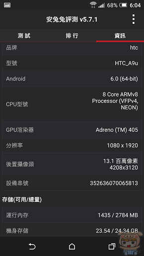 HTC One A9效能測試的部分,從安兔兔的的系統資訊上顯示使用Qualcomm® Snapdragon™ 617 八核心處理器,GPU為Adreno,螢幕的解析為1920X1080 高的解析度,可使用的記憶體容量全部為2784MB左右(視實際情形而定),可儲存的容量空間為24.34GB左右。