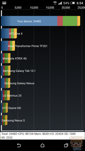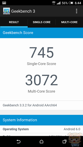 Quadrant Standard所測得的分數為24482分。GEEKBENCH3的測試分數Single-Core為475,Multi-Core為3072。