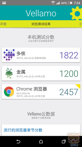 VELLAMO的網頁流暢度效能測試分數Chrome 瀏覽器 為2457分,多核為1822分,金屬為1200分。