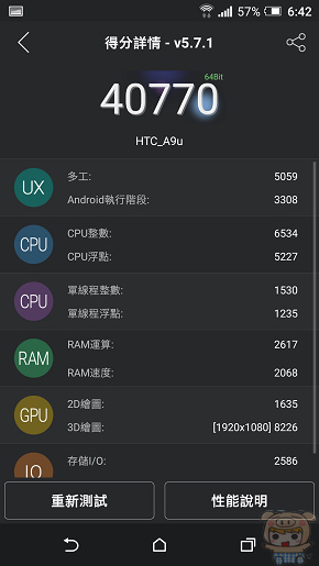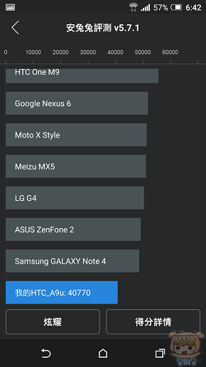 從上面HTC One A9所測得分數,與HTC的雙旗艦相差了一萬多分,不過本身處理器本來就是使用較為低階的處理器,雖然只有使用一下下,還在努力把玩中,整體上還算是蠻順工的,無論上網、看影片、拍照、臉書,收信件等等都沒有問題。以小米實際使用的經驗,其實跑分3萬之後的機子,大多是相當的順暢,這就像是使用電腦一樣啦。當然是越快越好,相對的硬體越高,費用當然也是不便宜就是了!HTC One A9早鳥優惠價,只要12900元,真的是相當吸引人。小米就先介紹到這邊啦,有興趣的朋友千萬別錯過早鳥優惠限量嘗鮮:http://www.htc.com/tw/htc-one-a9/