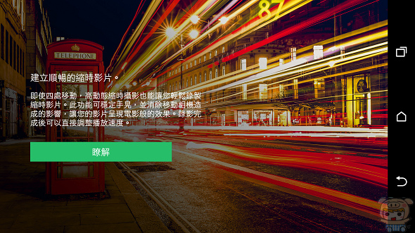 高動態縮時攝影:讓使用者能夠輕鬆的錄製縮時影片,穩定手晃並消除移動相機造成的影響,錄製出如果電影般的效果,錄影完成後,可以自由的調整速度,最高可調到12倍的速度。