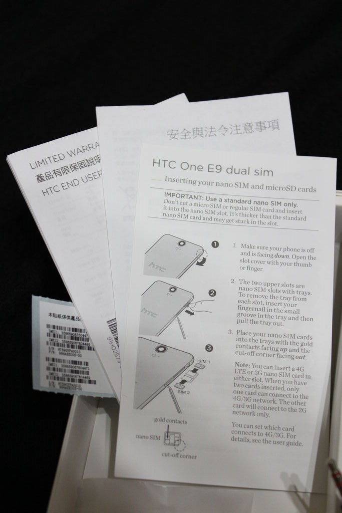 3 份說明文件。第一份建議一定要看, 它教你怎麼將 nano-SIM 以及 Mirco-SD 放入 HTC One E9 dual sim 內。