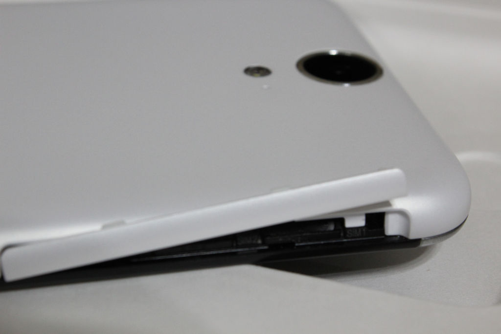 手機背面相當平整, 沒有凸起造型, 對手掌小的用戶比較不影響單手操作。背蓋採密封式設計, 使用者不能自己更換電池。nano-SIM 與 Micro-SD 插槽, 是隱藏在右下角長條狀飾板底下。
