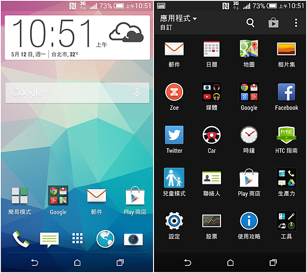 Desire 816在台灣上市是採用最新的HTC Sense 6.0,首頁介面差異不明顯,一樣是單色系的時鐘天氣,程式列表也是深色系的視覺,上下滑動查看詳細程式清單