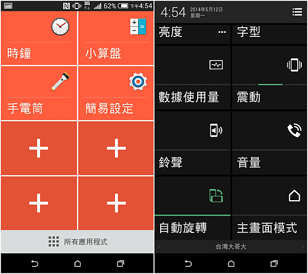 左右滑動可以新增更多常用的捷徑,如手電筒,計算機。在簡易模式裡,連設定都變的簡化了,包括常會用到的鈴聲,螢幕亮度,以及上網數據統計,這些都可以看出HTC對長輩常用的功能的觀察,我個人是認為恰到好處