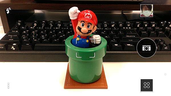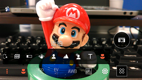 Desire 816的拍照模式如下,右上角查看上一張照片,左上角快速切換補光燈模式,右下角切換拍照/自拍/錄影模式,左下角為進階設定