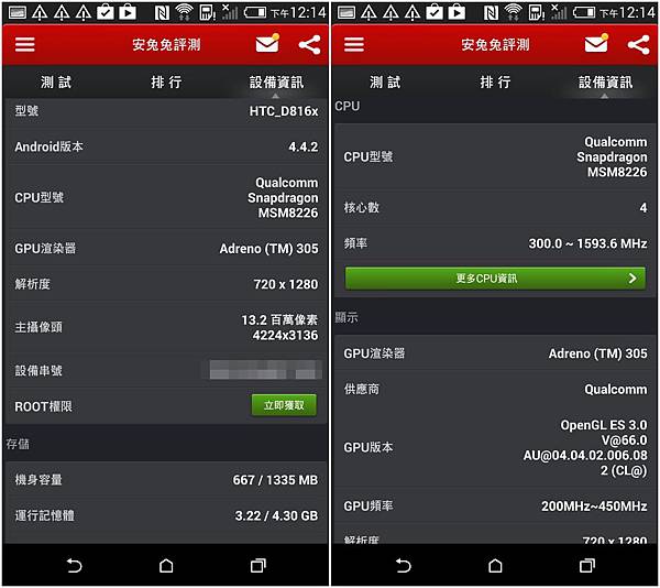 Desire 816內建1.5GB RAM,在還未安裝任何APP前,大約可用的RAM為700MB左右,安裝FB,LINE,以及whoscall這三個APP後大約可用的RAM降到444MB左右。電池採用2600mAh容量,大約可以使用2天多一些,進入電源管理可以打開切換省電模式延長使用時間